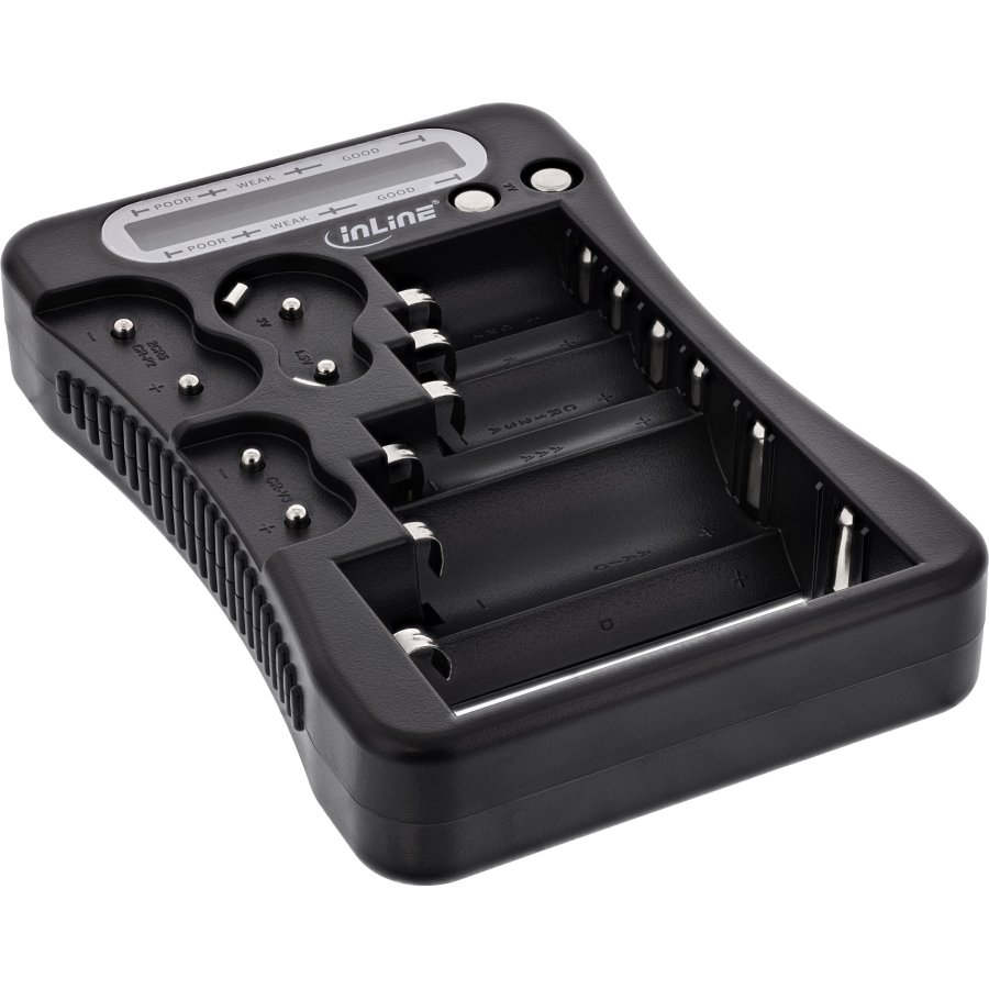 Con il testere universale per batteriel'InLine® è possibile controllare lo stato di carica di tutte le batterie disponibili in commercio e delle batterie ricaricabili. Possono essere testati oltre 12 tipi diversi di batterie. Dopo aver inserito la batteria nell'apposito alloggio, lo stato della capacità viene visualizzato sul pratico display LCD.
