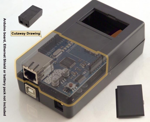Box per Arduino: Scatola di ABS [...] ignifugo che può ospitare una scheda Arduino (Duemilanove-Diecimila-NG o MEGA), un ETH shield e una batteria.