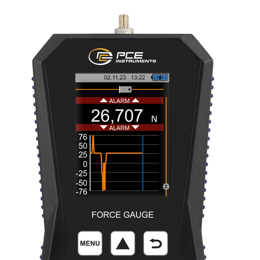 La memoria interna di 32 GB offre spazio per 30 milioni di punti di misura. Ciò consente di creare, salvare ed esportare i registri di misura. Il dinamometro dispone di un'interfaccia USB-C che può essere utilizzata per leggere i dati di misura nel software del PC. Il dinamometro è dotato di un LCD grafico che visualizza i valori misurati sia numericamente che graficamente. Inoltre, un grafico a barre mostra il valore misurato nell'intervallo di misura selezionato. Per adattare il dinamometro sono disponibili diversi supporti per prove di forza.