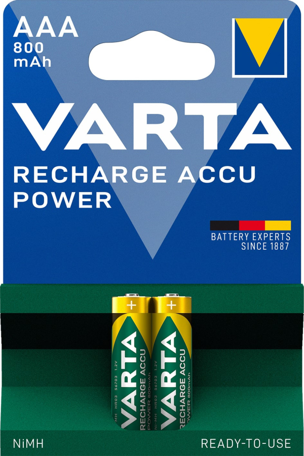 - La confezione include: blister da 2 batterie Varta Rechargeable Ready To Use Accu AAA Micro capacità nominale di 800mAh; blister completamente riciclabile
