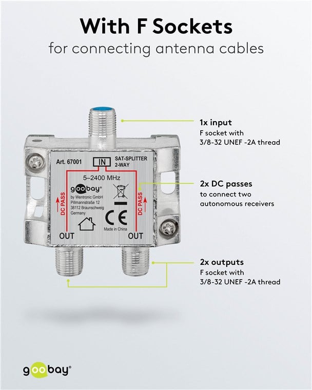 Divisore splitter per TV e Satellite 1 ingresso 2 uscite. può essere utilizzato per dividere il segnale TV oppure Satellite proveniente da antenna o parabola ed inviarlo a 2 prese/utenti.