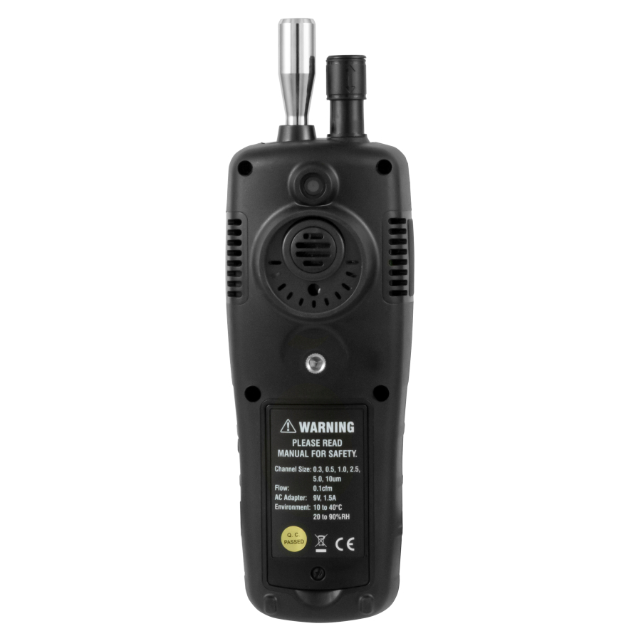 Misuratore per il conteggio delle particelle / Misura temperatura e umidità relativa / Memoria interna da 80 MB o scheda di memoria esterna SD (max. 8 GB) / Volume delle particelle: 0,3; 0,5; 1,0; 2,5; 5,0; 10 µm / Registrazione di immagini e video