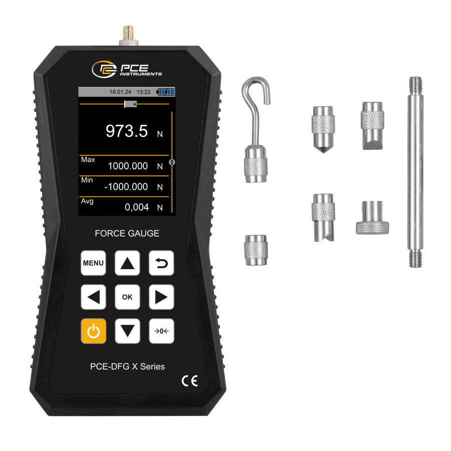 La memoria interna di 32 GB offre spazio per 30 milioni di punti di misura. Ciò consente di creare, salvare ed esportare i registri di misura. Il dinamometro dispone di un'interfaccia USB-C che può essere utilizzata per leggere i dati di misura nel software del PC. Il dinamometro è dotato di un LCD grafico che visualizza i valori misurati sia numericamente che graficamente. Inoltre, un grafico a barre mostra il valore misurato nell'intervallo di misura selezionato. Per adattare il dinamometro sono disponibili diversi supporti per prove di forza.